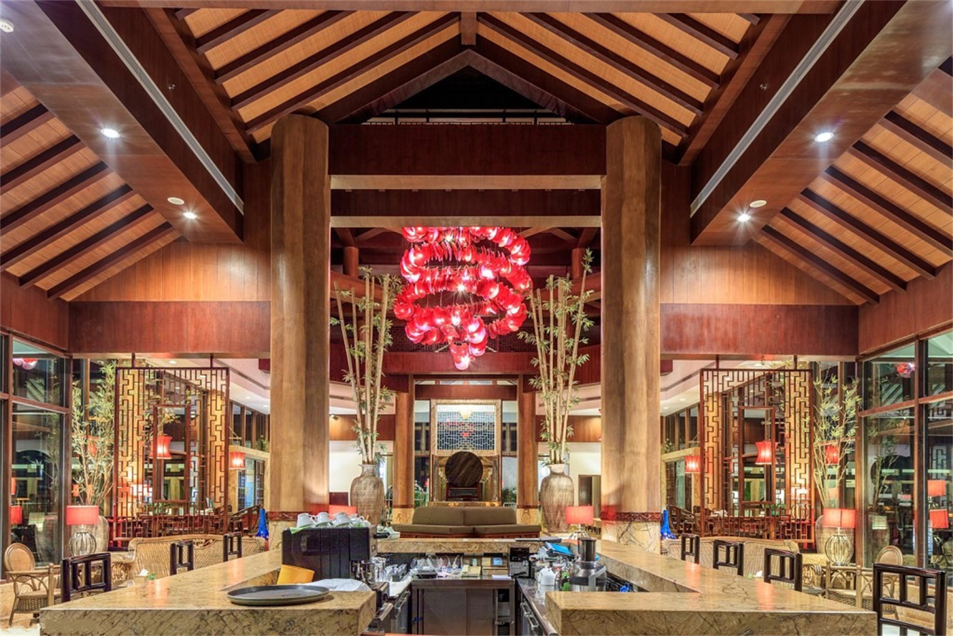 Step into the lobby of GuangYueHua YangShuo Riverside Resort Hotel, and warm, bright light cascades down from above, instantly enveloping you in a cozy embrace. The high - ceilinged space, adorned with exquisite and gorgeous chandeliers, sparkles like a myriad of stars, showcasing the vastness and grandeur of the area.
